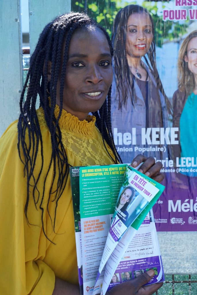Rachel Keke, candidate of the left-wing coalition New Ecologic and Social People’s Union (NUPES) for the 7th Val-de-Marne district, poses in front of her campaign poster ahead of the second round of the French parliamentary elections, in Thiais, near Paris, France, June 14, 2022. Picture taken June 14, 2022. REUTERS/Lucien Libert