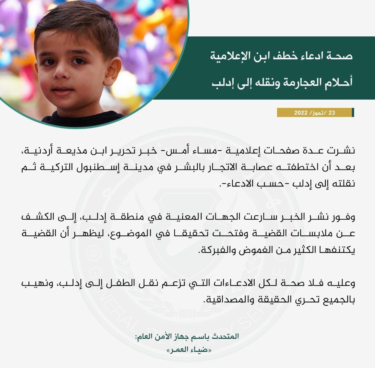 إذ بدأت القصة عندما نشرت العجارمة تسجيلاً مصوراً للحظة تسلمها ابنها من معبر باب السلامة الحدودي شمالي حلب، مدعيةً أن عصابة سورية لبنانية للاتجار بالبشر خطفته.