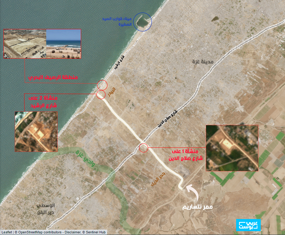 في نهاية ممر نتساريم من جهة الشاطئ، يقع اللسان البحري الذي أقامه الجيش الأمريكي ومؤسسة “المطبخ العالمي” منذ 1 أبريل/نيسان 2024، وفي 28 من الشهر ذاته، أعلن المتحدث باسم جيش الاحتلال أفيخاي أدرعي عبر حسابه في “إكس”، مشاركة الجيش الإسرائيلي في عمليات الرصيف البحري العائم الذي كان من المزمع ربطه باللسان البحري، لإيصال المساعدات الإنسانية بحراً إلى شمال غزة.