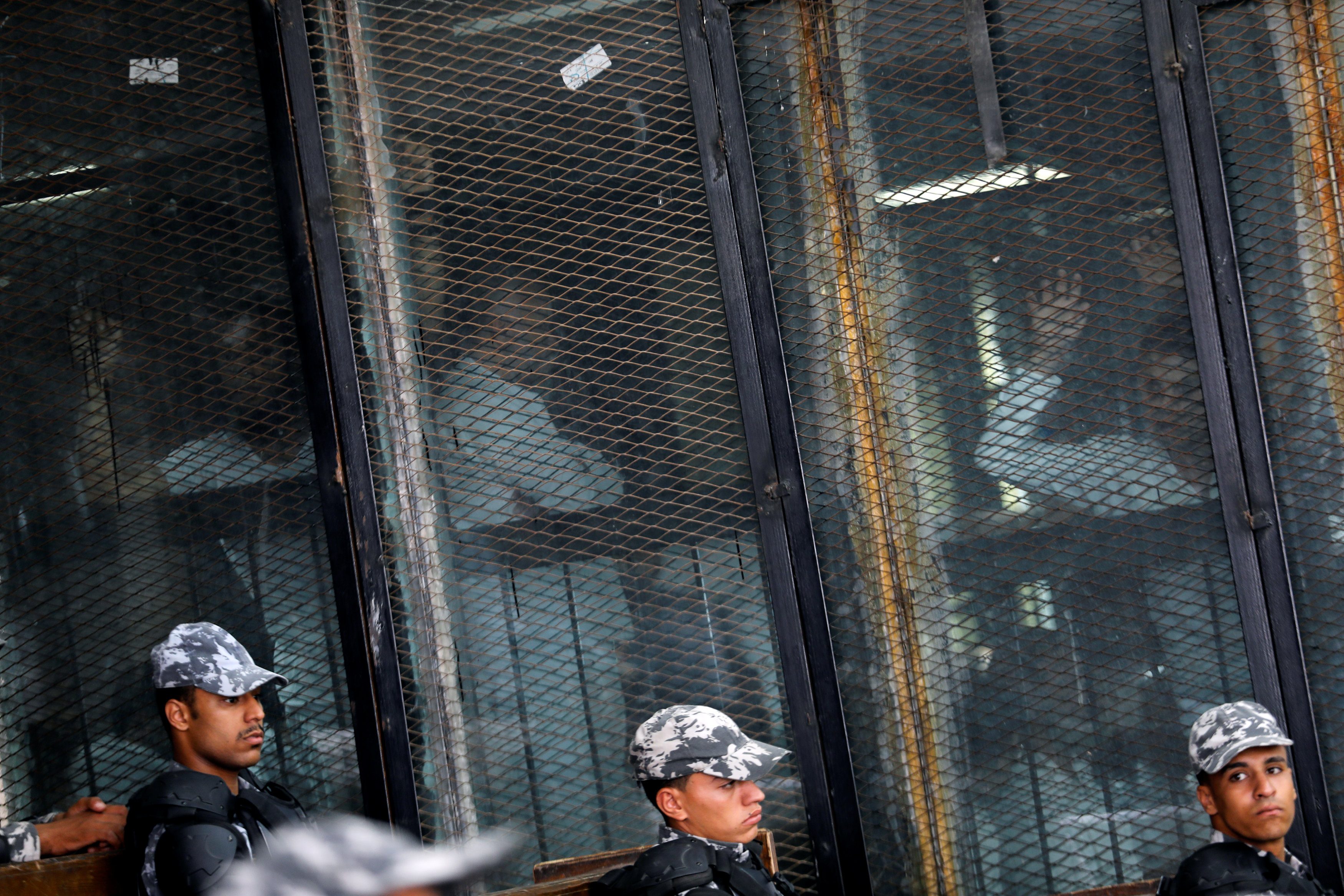 Police officers sit in the court as suspects are seen behind a fence in Cairo, Egypt July 28, 2018. REUTERS/Amr Abdallah Dalash