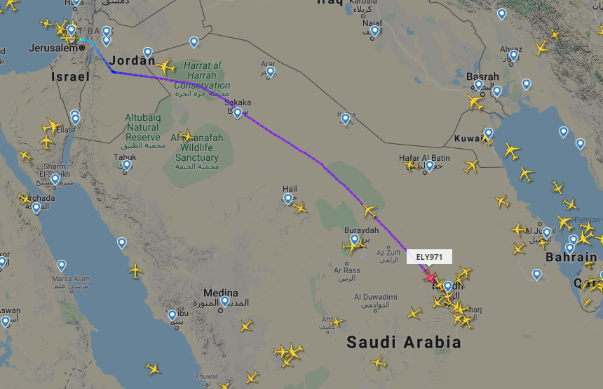 مرور علني من سماء المملكة: موقع تتبع حركة الطائرات flightradar24، بيّن المسار الذي تسلكه الطائرة التي أقلعت من مطار بن غوريون، ثم دخلت من الأردن إلى السعودية، وأظهرت صور الموقع أن الطائرة الإسرائيلية مرت فوق مدينة سكاكا، ويتوقع أن تُحلق فوق أو بجانب العاصمة السعودية الرياض. (ويمكن تتبع مسار الرحلة من هنا).