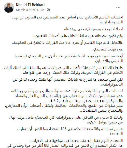 وأضاف المتحدث أن “مسألة القاسم الانتخابي بهذا الشكل غير موجودة في أي بلد من بلدان العالم حتى الدول المتخلفة منها، فما بالك ببلد مثل المغرب، يسعى إلى التموقع مع الدول الكبرى”.
