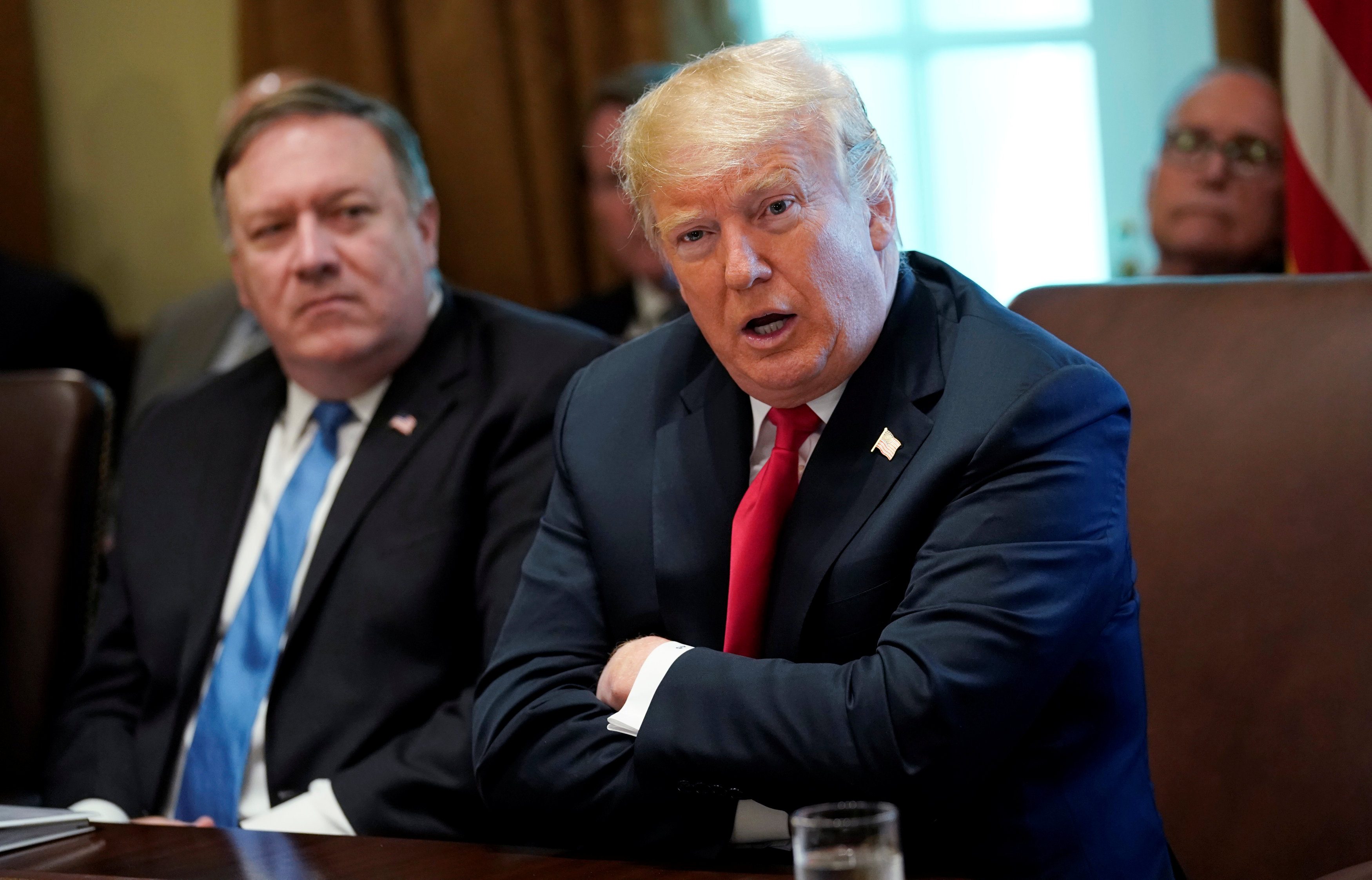 U.S. President Donald Trump addresses members of his cabinet and the news media as Secretary of State Mike Pompeo looks on during a cabinet meeting at the White House in Washington, U.S., August 16, 2018. REUTERS/Kevin Lamarque