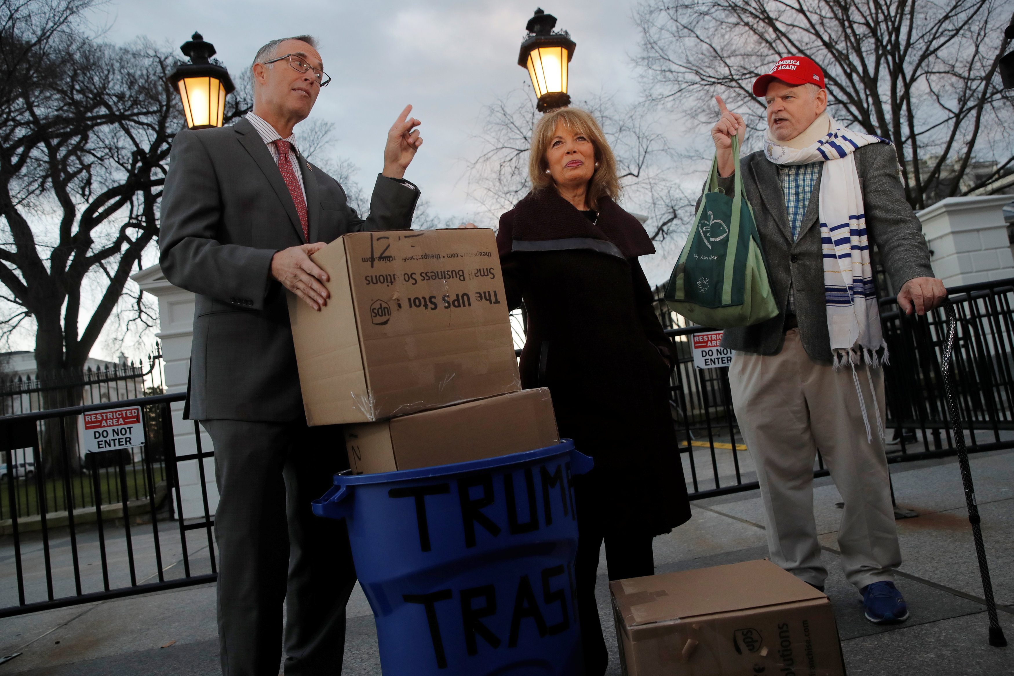 وبحسب نيوزويك، الأربعاء 9 يناير/كانون الثاني 2019، فإنه في فيديو مباشر على فيسبوك، ظهرت جاكي سبيس وجاريد هوفمان، النائبان من ولاية كاليفورنيا، وهما يحملان سلالاً تحمل اسم “مهملات ترامب” إلى البيت الأبيض، قبل مخاطبة المراسلين الصحافيين.