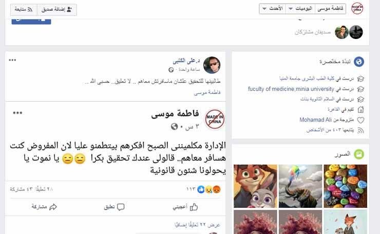 نقلت الصحف والمواقع المصرية، وأبرزها "مصراوي"، عن طبيبة تدعى فاطمة موسى، إحدى طبيبات محافظة المنيا، التي كان من المُفترض أن تكون ضمن فوج الطبيبات المنتدب للتدريب، قولها إنها أحيلت إلى التحقيق.