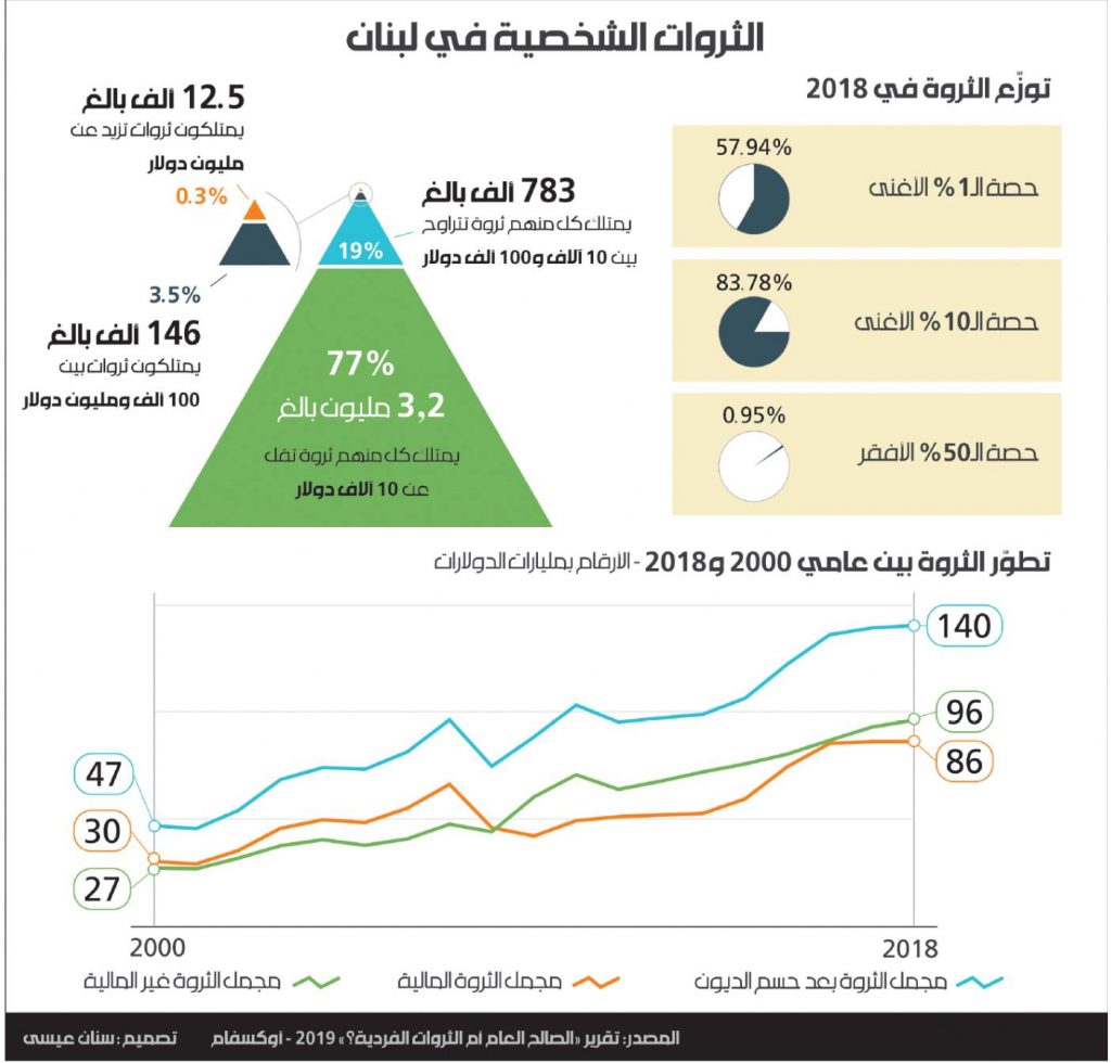 فوفقاً لصحيفة الأخبار اللبنانية، فإن أغنى 1% من المواطنين يملكون 58% من ثروة لبنان، في حين أن أفقر 50% يملكون أقل من 1%.