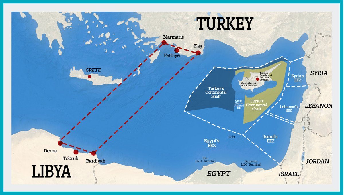 وتتقاطع المنطقة الممتدة من جنوب غربي تركيا إلى شمال شرقي ليبيا، مع منطقة تطالب اليونان وقبرص حالياً بأحقيتهما فيها، ويجري العمل فيها كذلك على خطط لإنشاء خط غازٍ مستقبلي يربط حقول الغاز الواقعة شرقي المتوسط بالأسواق الأوروبية.