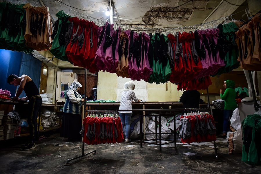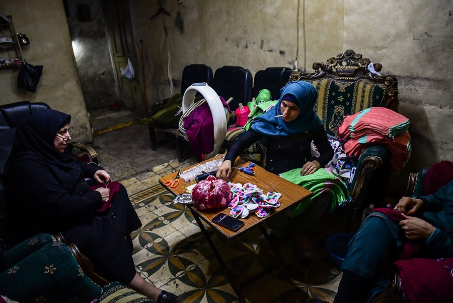 دُهش محمد داغر (38 عاماً)، عند تلقِّيه فيضاً من المكالمات من الأرامل الباحثات عن عمل عندما أعاد فتح مصنعه منذ 3 أعوام. والآن، هناك كثير من النساء العاملات هناك في قسم تفصله ستارة مُسدلة، يقطعن الخيوط الزائدة ويتحققن من الخياطة.