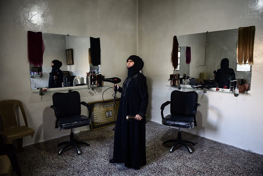 تُقدم فاطمة خدمات المكياج وتشذيب الحواجب وقصّ وكَي الشعر للنساء المحجبات مثلها. وقد ظللن يعتنين بمظهرهن على الرغم من كل شيء. “هل علينا أن نموت بعد أن مات أزواجنا؟!”.