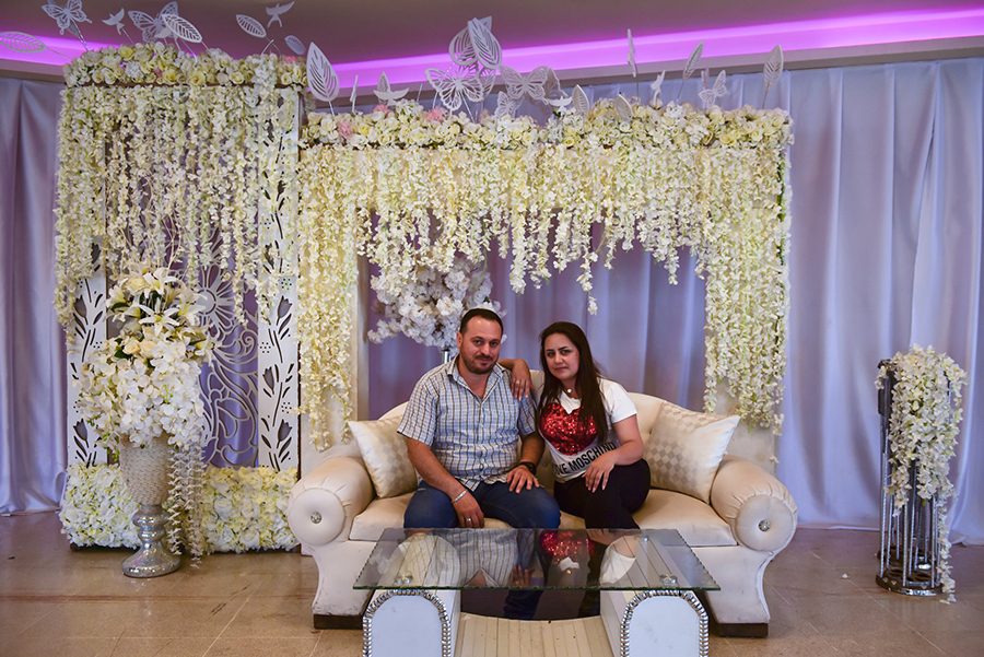 على مسافة تبعد ساعات قليلة من حلب، في مدينة اللاذقية الساحلية، كانت “لقاء الشيخ” وخطيبها يقفان لالتقاط الصور في قاعة الأفراح المُصممة على طراز مصر الفرعونية القديم، حيث التقيا أول مرة وحيث سيتزوجان في نهاية المطاف. جلسا لالتقاط صورة على أريكةٍ بيضاء تحيط بهما الأضواء الوردية ومتوَّجَين بزهور بيضاء مزيفة؛ عُرس الأحلام المتلألئ.