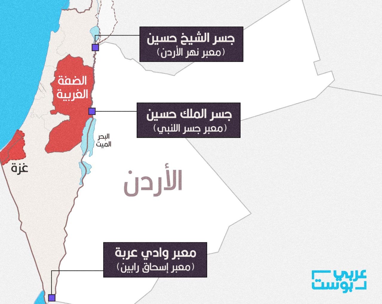 فيما يرتبط الأردن مع إسرائيل بثلاثة معابر حدودية، هي الشيخ حسين (نهر الأردن من الجانب الإسرائيلي)، وجسر الملك حسين (اللنبي)، ووادي عربة.