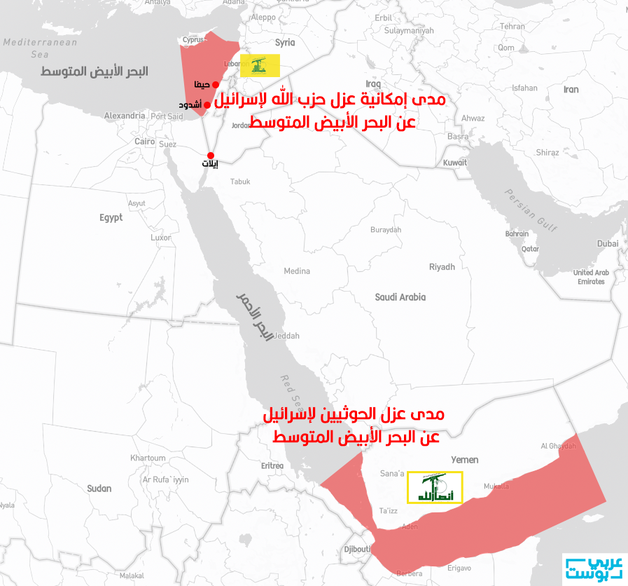 أما في البحر الأحمر، فإنه سبق أن أعلن الميناء الإسرائيلي الوحيد على البحر الأحمر، في إيلات، عن انخفاض في النشاط بنسبة 85% منذ بدء هجمات الحوثيين، كما أن صادرات البوتاس من البحر الميت، فضلاً عن واردات السيارات المصنعة في الصين -والتي تشكل 70% من مبيعات السيارات الكهربائية في إسرائيل- تعتمد على إيلات.