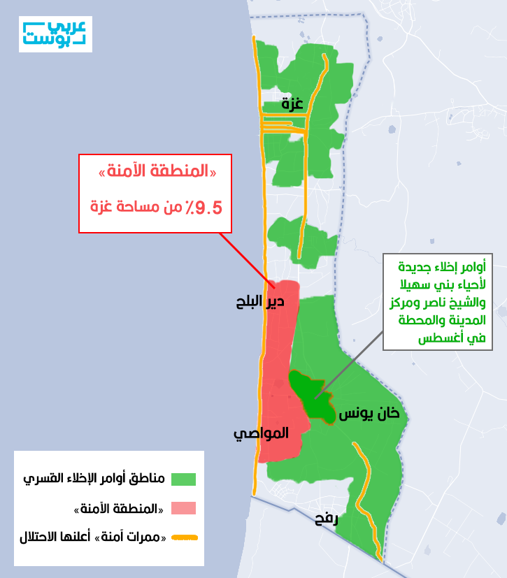 بحسب وكالة غوث وتشغيل اللاجئين الفلسطينيين “أونروا”، أثّرت أوامر الإخلاء في أغسطس/آب 2024 على 250 ألف فلسطيني بقطاع غزة، يضافون إلى أكثر من مليون شخص في “المنطقة الآمنة” التي تقع من دير البلح في الوسطى إلى المواصي في خان يونس، غربي غزة وحتى رفح جنوباً.