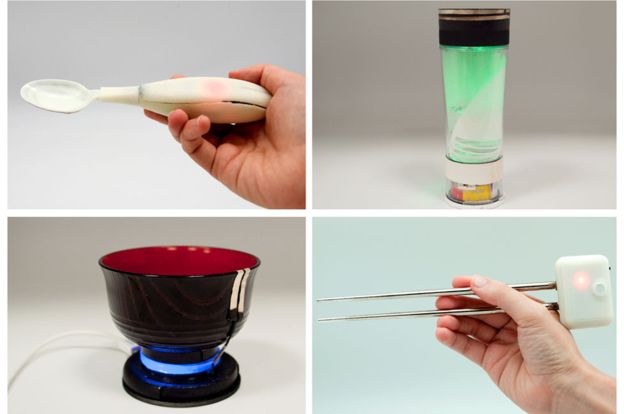 على سبيل المثال، باستخدام ملعقة أو عيدان تناول الطعام يمكنك أن تأكل البطاطا المهروسة من دون ملح وتشعر بالطعم المالح، وباستخدام وعاء خاص يمكنك زيادة الشعور بالحمضية لحساء غير حامض.