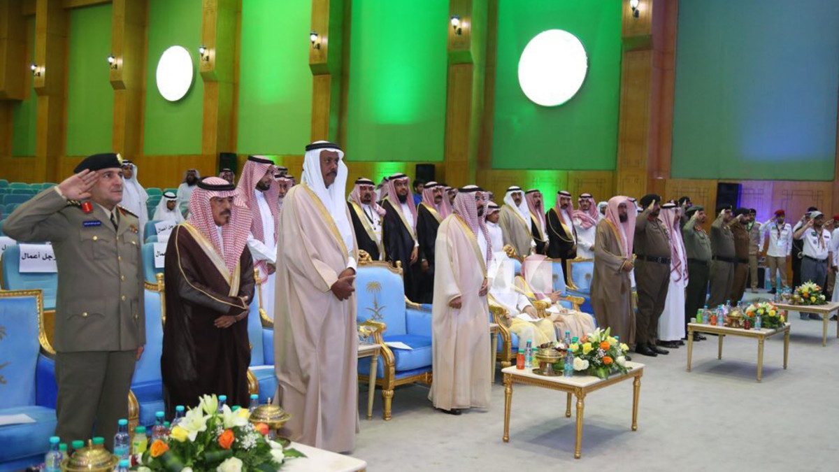 وإلى جانبهما مباشرة من على الجهة اليمنى الشيخ عبيد الجلال، المدير العام لفرع وزارة الشؤون الإسلامية والدعوة والإرشاد بمنطقة الجوف، الذي اعتبر وقوفه للسلام الوطني تجسيداً لرمزية الوطن، وما يحمله من تقدير لبلاده وإعزازاً له.