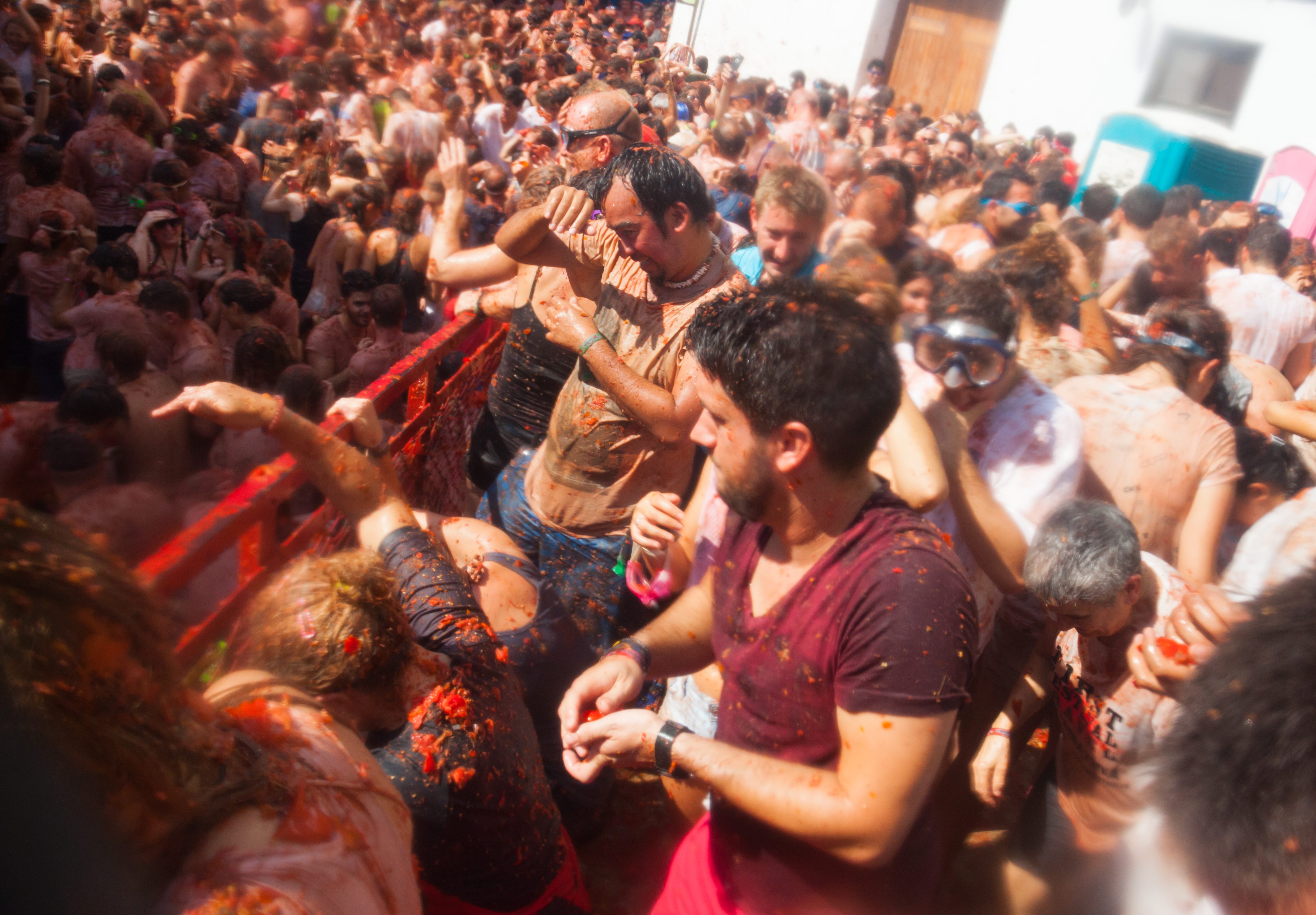 BUNOL, SPAIN - AUGUST 30, 2018: People during La Tomatina festival. La Tomatina festival where people are fighting with tomatoes at street