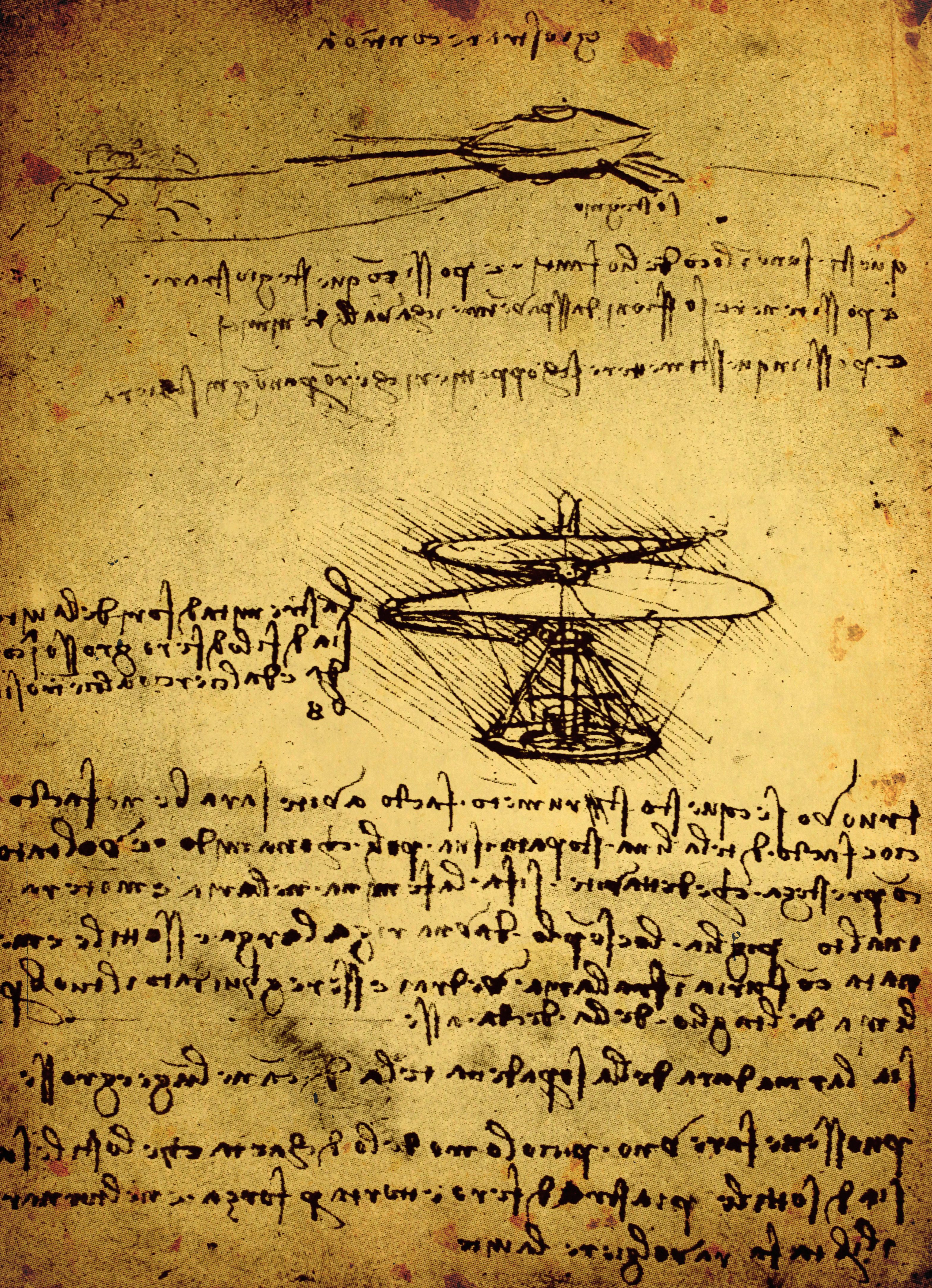 رسم دافنشي رسومات توضيحية لهيكل الطائرة المروحية في أواخر القرن الخامس عشر، وكان يطلق عليها Helical Air Screw، والجدير بالذكر أنّ الطائرات في هذه الأيام تتشابه إلى حدٍ كبيرٍ مع رسومات دا فنشي القديمة.