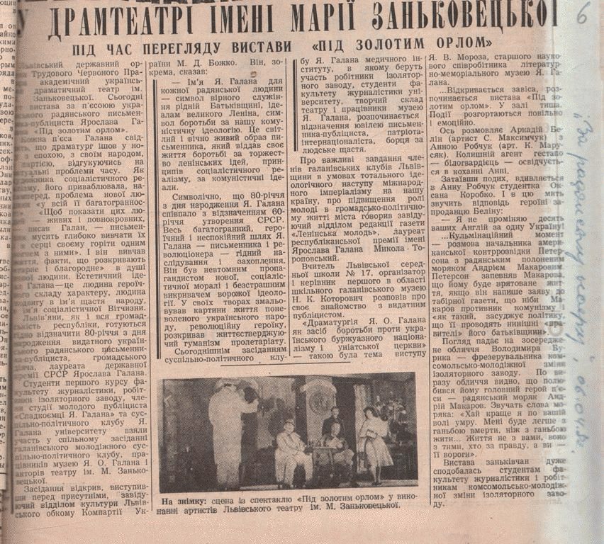 في أوقات الرقابة الصارمة، سعت جاهدة إلى ترويج الفن والأدب المحلي، وشاركت في إنشاء وتطوير المسرح في كييف. اليوم، هناك مسرح باسمها في لفيف يُعتبر من المعالم الرئيسية بالبلاد.