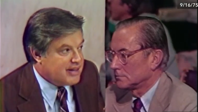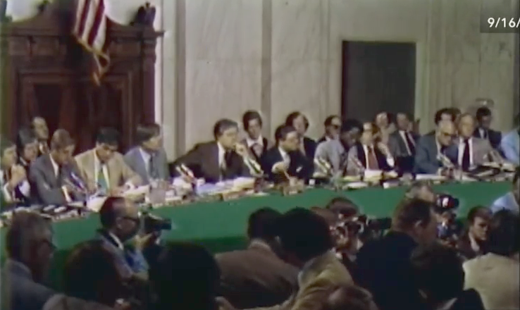 مدير CIA وليام كولبي (إلى اليمين)، خلال جلسة الاستماع إليه أمام لجنة تشيرش (اليسار)