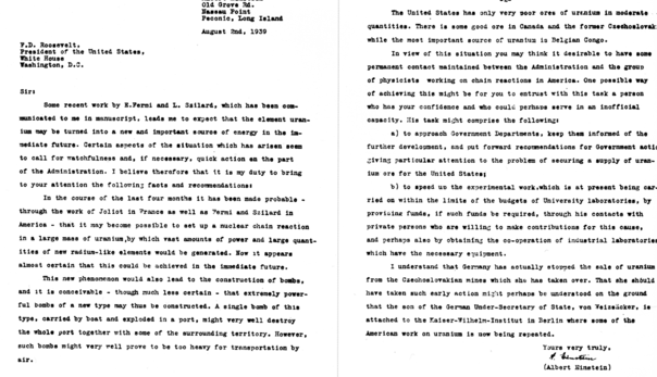 وأواخر تموز/يوليو 1939، قام كل من زيلارد عالم الفيزياء المجري الأمريكي وأينشتاين عالم الفيزياء الألماني وزاكس المصرفي والخبير الاقتصادي الأمريكي بإرسال رسالة إلى رئيس الولايات المتحدة الأمريكية فرانكلين ديلانو روزفلت يقترحون فيها أن تبدأ الولايات المتحدة برنامجها النووي قبل أن تسبقها إليه ألمانيا.