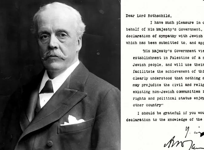 تعتبر الرسالة التي بعث بها وزير الخارجية البريطاني جيمس آرثر بلفور عام 1917 إلى اللورد ليونيل روتشيلد أحد زعماء الحركة الصهيونية في تلك الفترة، والتي عرفت فيما بعد باسم وعد بلفور، أول خطوة يتخذها الغرب لإقامة كيان لليهود على تراب فلسطين.