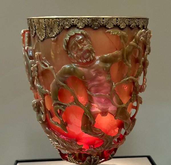 هو واحد من أكثر الأعمال الزجاجية تعقيدًا وتطورًا التي أُنتجت قبل العصر الحديث، ويعود تاريخه إلى الفترة ما بين 290 و325 ميلادي. يُظهر هذا الكأس بشكل لا يدع مجالًا للشك براعة الحرفيين القدماء، إذ يتميز بخاصية فريدة، فرغم أنه يبدو بلون أخضر باهت عند رؤيته بالعين المجردة، إلا أنه يظهر باللون الأحمر الدموي عند إضاءته من الخلف أو الداخل، وقد تحقق هذا التأثير بفضل دمج جزيئات نانوية من الذهب والفضة في الزجاج.