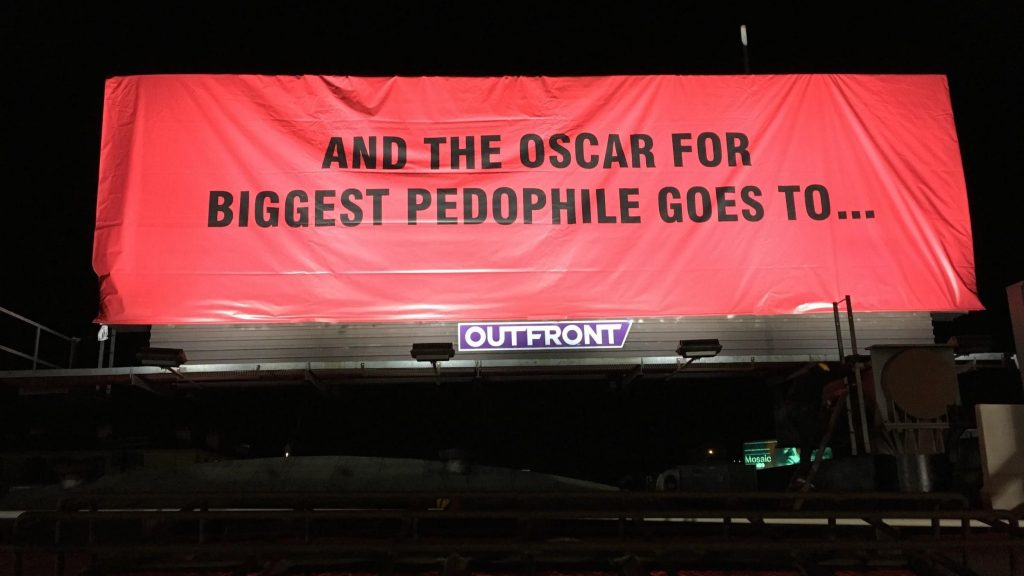 ومثل تلك الموجودة في الفيلم، كانت اللافتات باللون الأحمر ومكتوباً عليها بحروف سوداء، تحمل 3 رسائل شديدة اللهجة، جاء فيها بالترتيب “جائزة الأوسكار لأكبر متحرش بالأطفال تذهب إلى، جميعنا نعلم ولم يُقبض على أحد، أفصِحوا عن الأسماء على المسرح أو اخرسوا”.