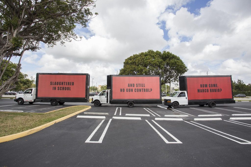 استوحت المجموعة فكرة الفيلم وقاموا بوضع 3 لوحات مماثلة على 3 شاحنات تجولت بمدينة ميامي فلوريدا، وأمام مكتب روبيو؛ للاحتجاج على تصريحاته. “قُتلوا في المدرسة، ولا تزال السيطرة على الأسلحة منعدمة، كيف ذلك ماركو روبيو؟!”.