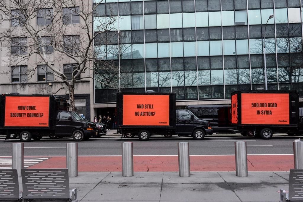 استخدمت منظمة أطباء من أجل حقوق الإنسان، الخميس 22 فبراير/شباط 2018، 3 لوحات معلقة على شاحنات للتحرك أمام مبنى الأمم المتحدة بنيويورك، تتضمن 3 رسائل: “500 ألف قتيل في سوريا، ولم يتُخذ أي إجراء، كيف ذلك يا مجلس الأمن؟!”.