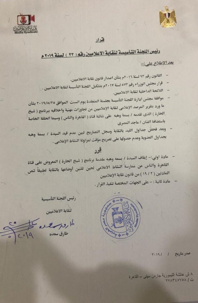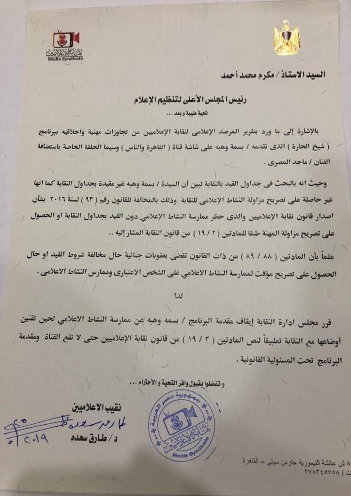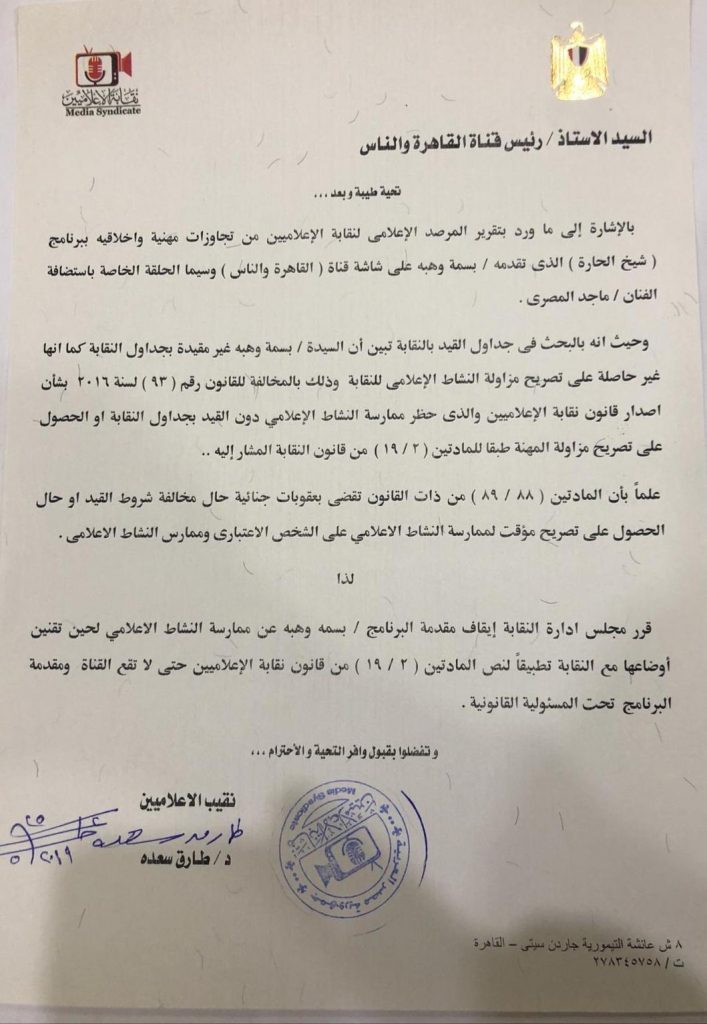 أكد طارق سعدة، نقيب الإعلاميين، أن مجلس النقابة اتخذ قراراً يقضي بوقف بسمة وهبة، بناءً على تقرير المرصد الإعلامى للنقابة، وما رصده من تجاوزات مهنية وأخلاقية بحلقة الـ19 من مايو/أيار 2019، التي استضافت فيها الفنان ماجد المصري، والتي خالفت ميثاق الشرف الإعلامي، ومدونة السلوك المهني.