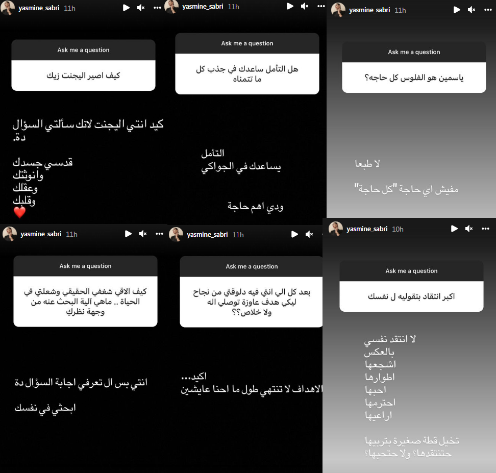 قدّمت الفنانة المصرية ياسمين صبري عدة نصائح لمتابعيها على حسابها بموقع التواصل الاجتماعي إنستغرام، وقامت بالرد على الكثير من التساؤلات التي طرحها جمهورها، فيما يتعلق بتجربتها في تطوير الذات وتحسين الصحة النفسية.
