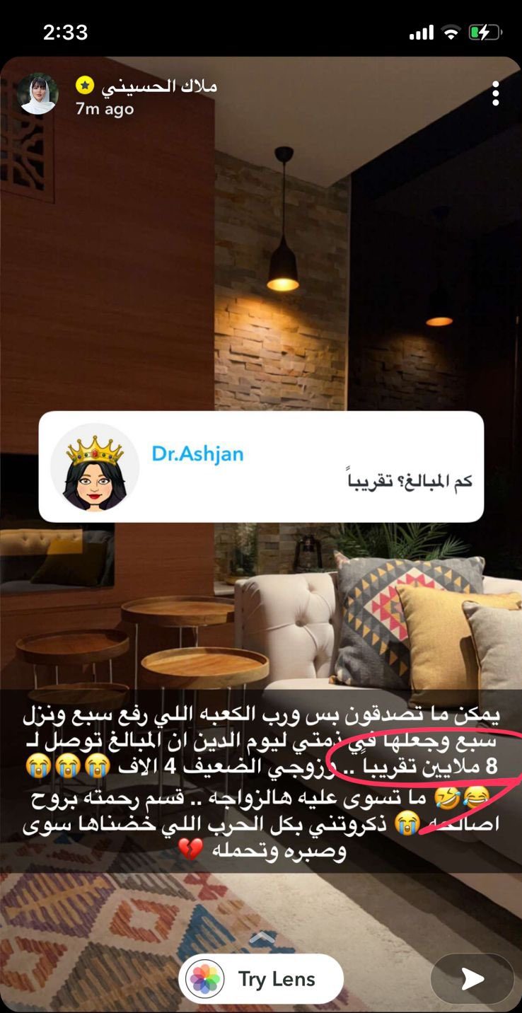 وعن الأموال التي خسرتها، قالت الحسيني إن قيمتها وصلت إلى 8 ملايين ريال سعودي. كما أكّدت أن تلك الصديقة رفعت على زوجها أنس التميمي أيضاً دعوى قضائية لتحصيل دين مزعوم قيمته 4 آلاف ريال سعودي.