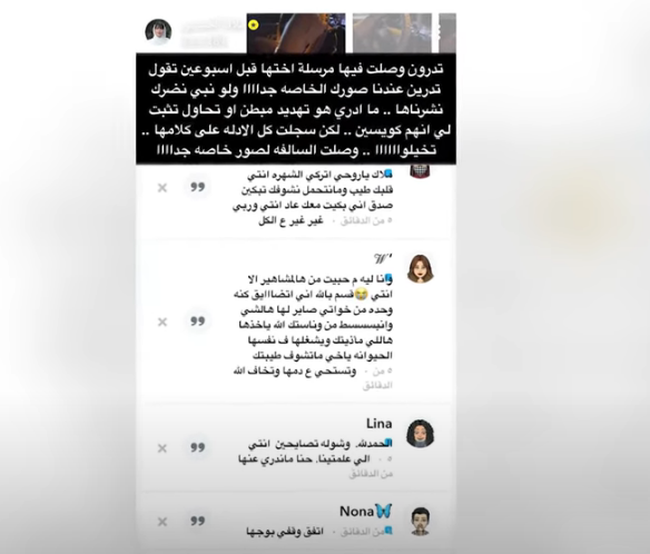 “تخيّلوا وصلت السالفة لصور خاصة جداً”، بهذا الاستغراب تابعت الحسيني تتحدث عن وصول الصور إلى يد صديقتها، وقالت: “ترى كانت موديل وتدير إعلاناتي، ومعها جوالي وتعرف باسورد كل شيء، كنا ننام بسرير واحد”.