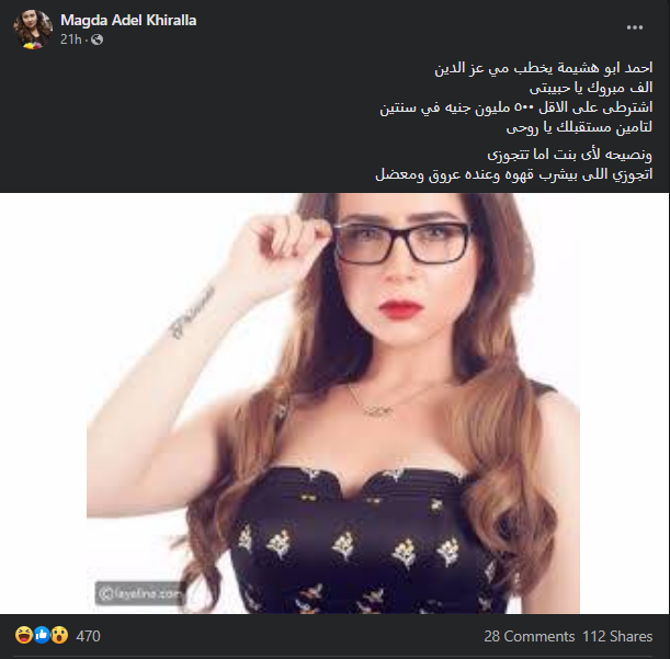 وأضاف المنشور: “اشترطي على الأقل ٥٠٠ مليون جنيه في سنتين، لتأمين مستقبلك يا روحي. نصيحة لأي بنت إما تتجوزي.. اتجوزي اللي بيشرب قهوة، وعنده عروق ومعضّل”.