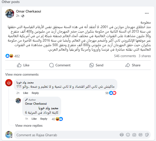 ورفض الإفصاح عن حجم بيع التذاكر أو إذا كان ضعف الإقبال قد فاجأ المنظمين. ولم يتسنّ الحصول على تعليق فوري من جمعية مغرب الثقافات المنظمة للمهرجان.