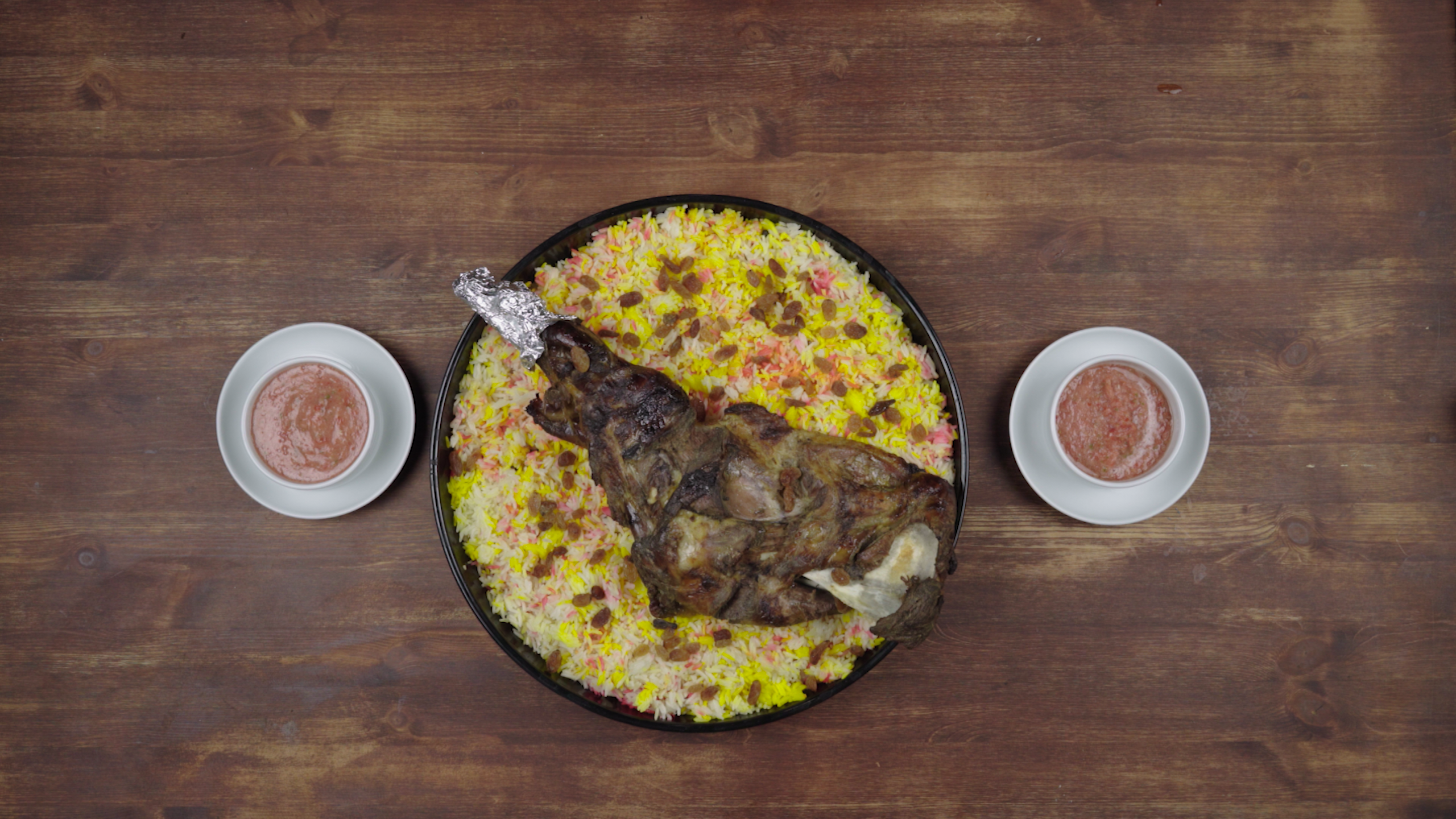16- يوضع الأرز في صينية وفوقها فخذ اللحم ويُقدّم إلى جانب صوص المندي.