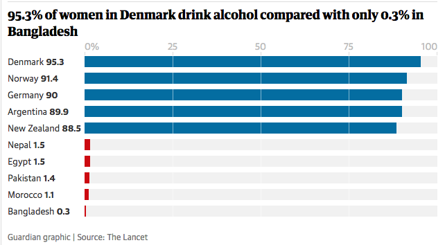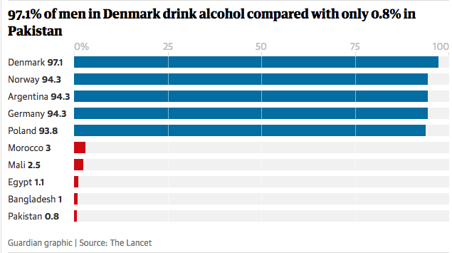 وتوضح الدراسة أن واحداً من كل 3 أو 2.4 مليار شخص بأنحاء العالم يشربون الخمر، وهم في خطر محقق؛ أي ربع النساء و39% من الرجال يشربون، وتختلف النسبة بين الدنمارك التي لديها أعلى نسبة (95.3% من النساء، و97.1% من الرجال)، وباكستان التي تحتفظ بأقل نسبة للرجال الذين يشربون (0.8%) وبنغلادش أقل عدد من النساء (0.3%).