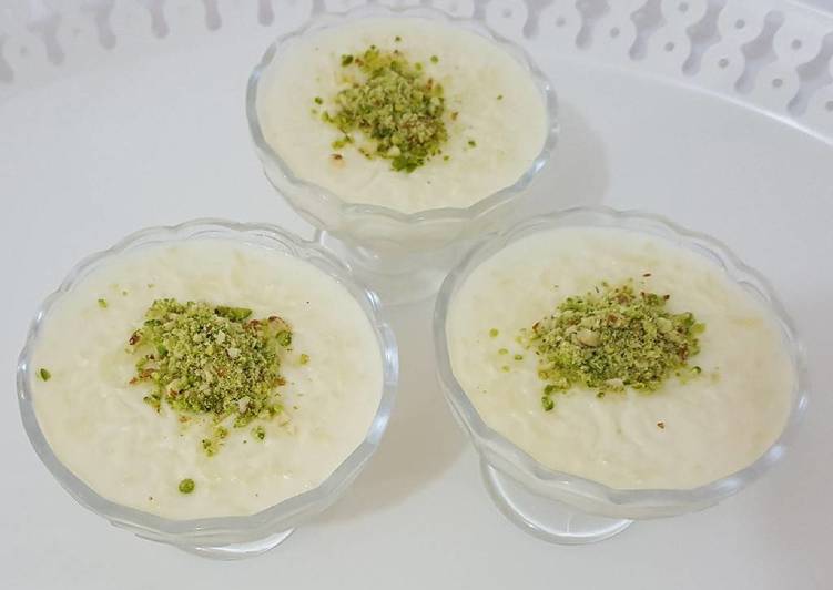 - نسكب الأرز بالحليب في أوانٍ عميقة ونزينها بجوز الهند والفستق المبشور، ونتركه حتى يبرد تماماً، ومن ثم نضعه في الثلاجة حتى يصبح وجهه مجعداً.