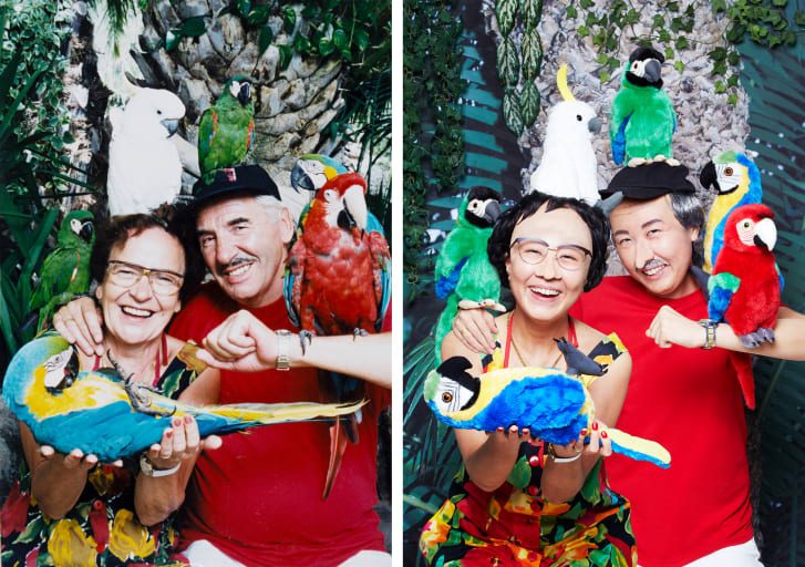 من صورها المفضَّلة صورةٌ لزوجين مسنَّين بملابس زاهية الألوان يبتسمان بينما يتِّخذان أوضاعاً لعوبةً بصحبة ببغاوات.
