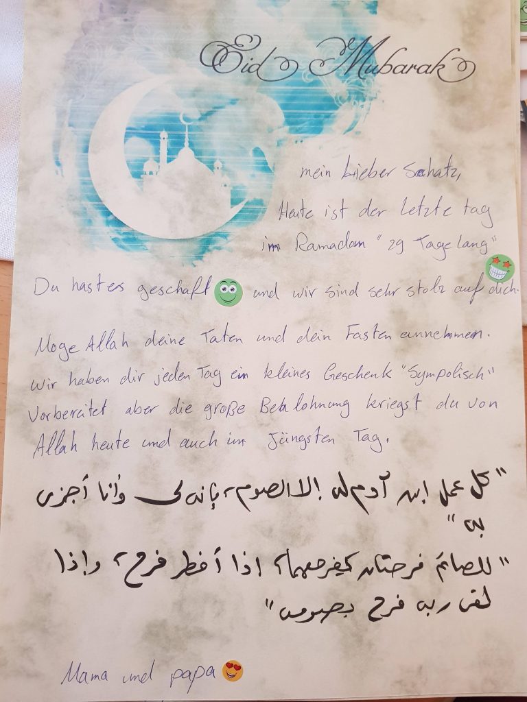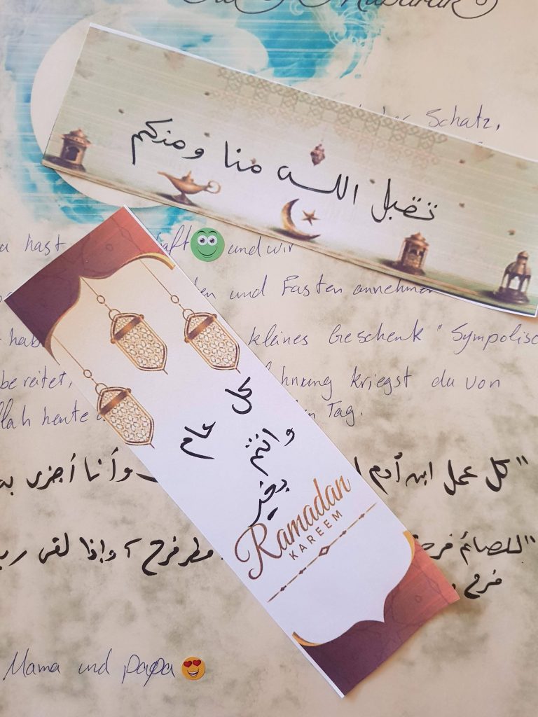في العام الماضي خطرت لي فكرة، أنني لا أريد أن تكون فقط من الحلوى، وأريدها أن تكون داعمة بشكل أكبر لأبنائي في رمضان، العام الماضي، حيث إنه مازال يحتوى على عدد ساعات الصيام الأطول، في جو يزداد حرارة في الصيف في ألمانيا كل عام، فقررت أن أجعل Ramadankalender عبارة عن هدية صغيرة لكل يوم، بدلاً من قطعة الحلوى.