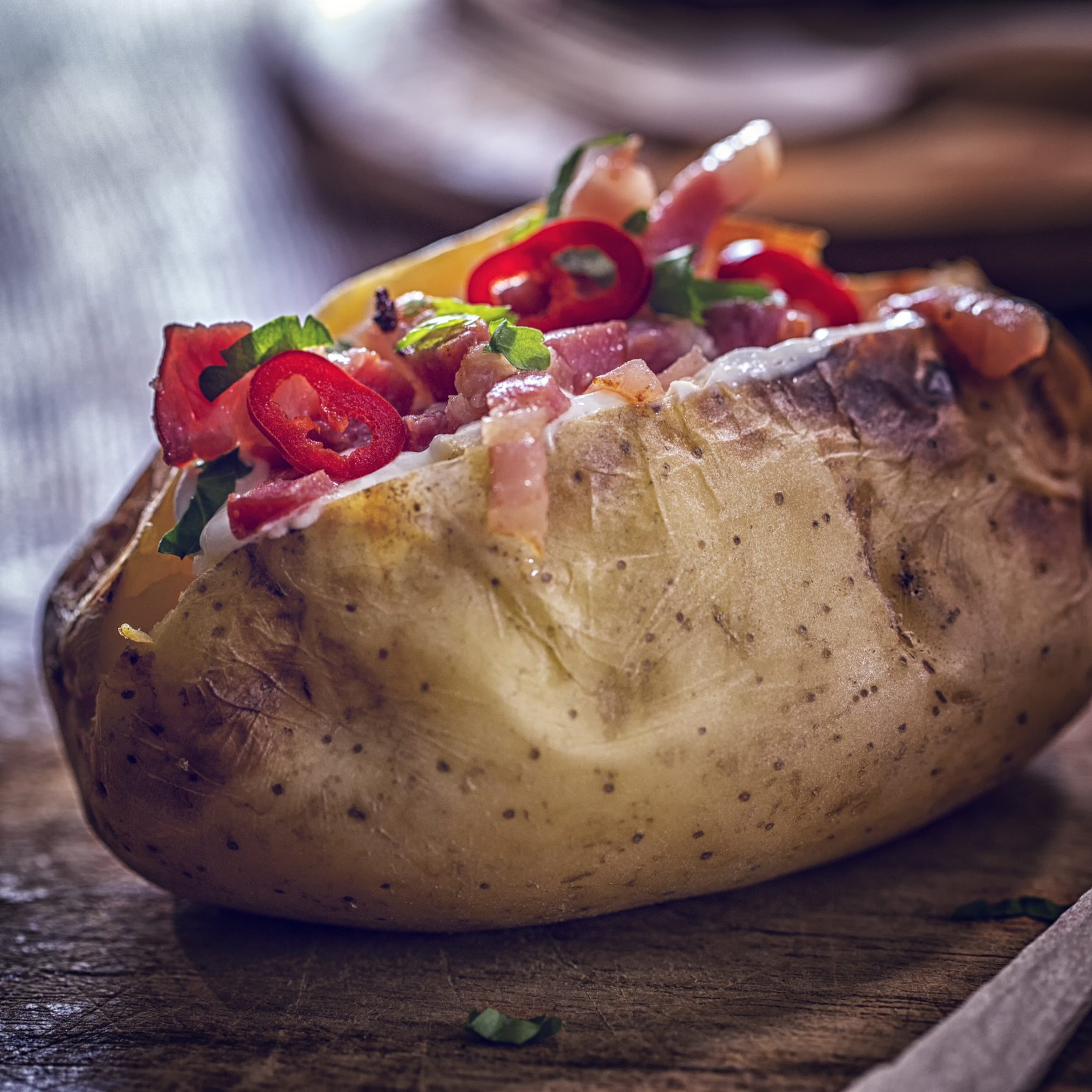 1. قم بلف حبة البطاطا بالقصدير واخدشها بالشوكة بأماكن متفرقة حتى تصل الحرارة إلى الداخل، ثم ضعها في الفرن حتى تنضج تماماً.