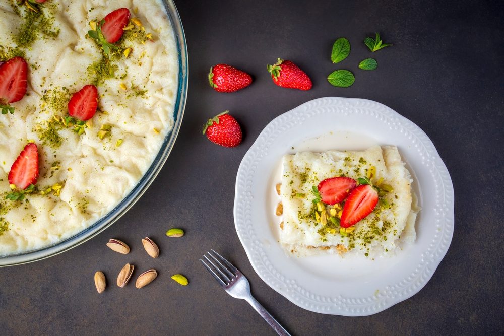 تكون العجينة على شكل طبقات متداخلة، كما يضاف إليها الحليب وماء الورد، بالإضافة إلى بذور التوت وأنواع مختلفة من المكسرات.
