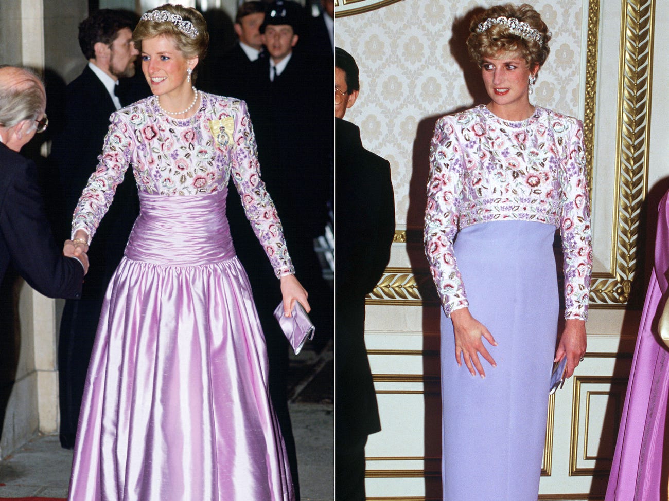 ارتدت الأميرة ديانا هذا الثوب المنقوش بالزهور خلال لقاء رئيس نيجيريا في عام 1989، فيما ظهرت به بعد التعديل خلال حفل عشاء في العاصمة الكورية سيول، في عام 1992.