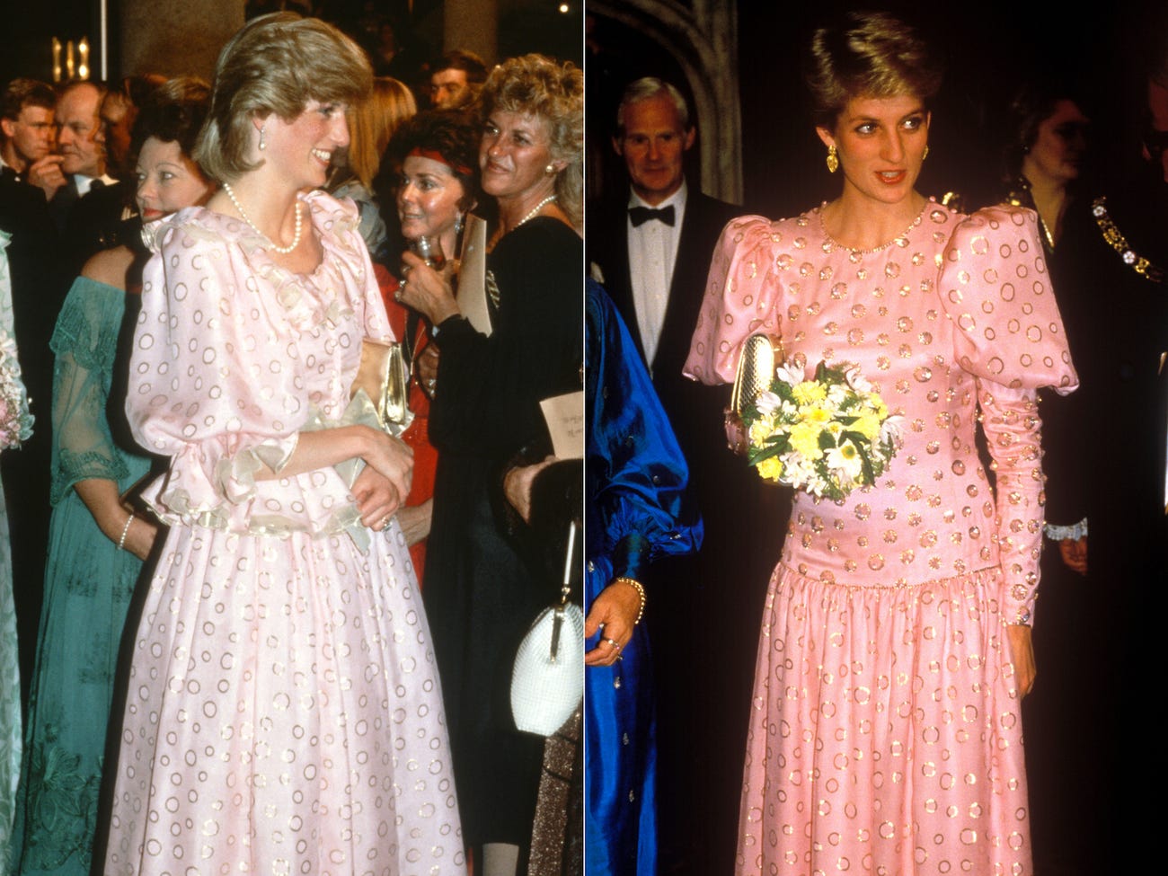 ارتدت الأميرة ديانا هذا الزي المسائي ذا اللون الوردي الفاتح في ملبورن في عام 1983، وفي ذلك الوقت كان للفستان أكمام أقصر، وكشكشة حول الخصر والذراعين والرقبة.