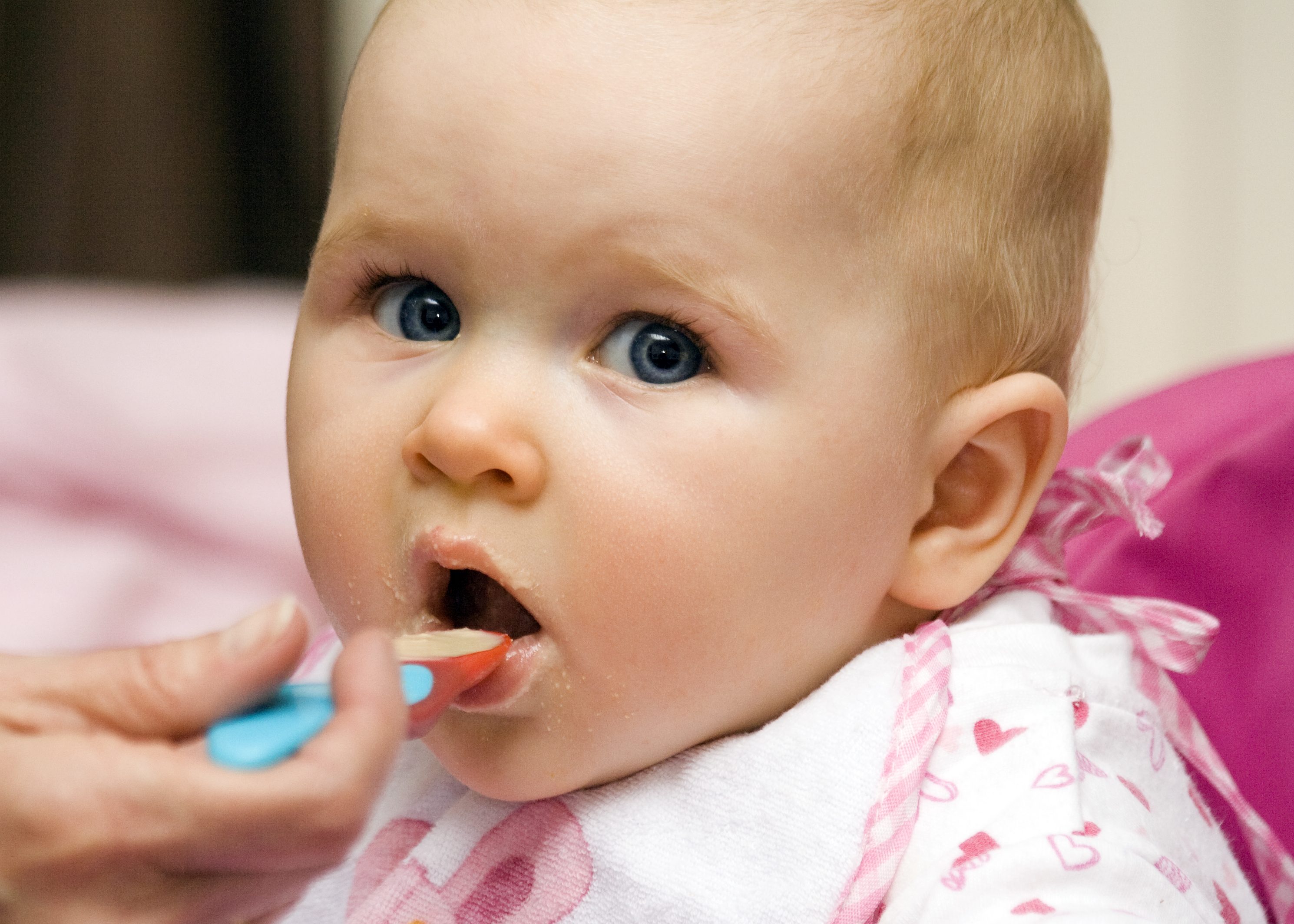 فيما يخص أول تجربة لطفلك في تناول الأطعمة الصلبة يبدأ معظم الآباء بملعقة صغيرة من حبوب الأطفال المزودة بالحديد (مثل حبوب الأرز) ممزوجة بـ4 أو 5 ملاعق صغيرة من حليب الأم.