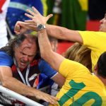 هذه السيدة المسكينة وقعت بين أيدي مشجعين وعلقت بينهما.. مشاجرة وتبادل لكمات على المدرجات خلال مباراة البرازيل وصربيا!