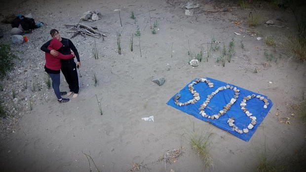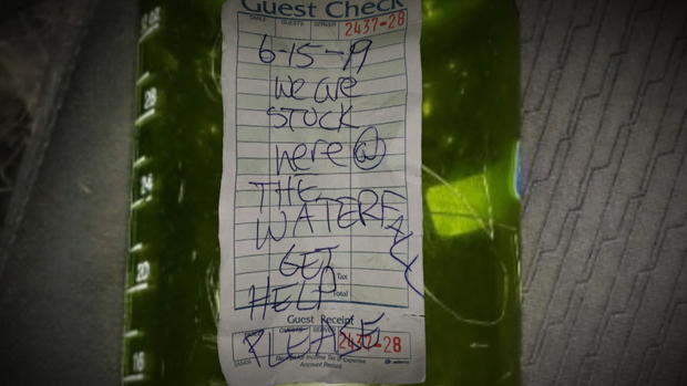 كان على بُعد أميالٍ من أقرب مخيم ولا يملك تغطيةً للهاتف الجوَّال، لذا لجأ إلى كتابة رسالة استغاثة على شريط من ورق التنظيم، جلبته صديقته فيما يبدو، لتدوين الدرجات خلال اللعب بالأوراق: “نحن محاصَرون هنا في الشلال. اجلبوا المساعدة رجاءً”. ووضع الرسالة في زجاجة ماء خضراء، نحت على جانبها “ساعِدونا”، وألقى الرسالة في مجرى النهر.