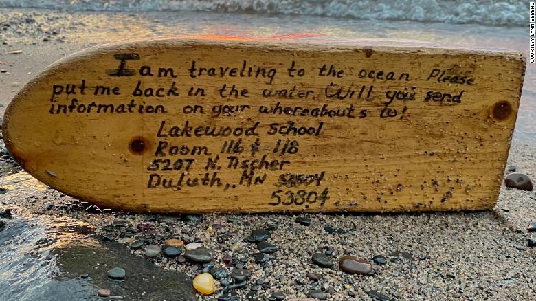 شبكة CNN الأمريكية قالت الجمعة، 16 أكتوبر/تشرين الأول 2020، إن قارباً صغيراً يحمل ألوان الأحمر والأبيض والأزرق عُثر عليه في منطقة نائية، وكان يحمل رسالة على قاعدته تقول: “أنا مسافر إلى المحيط، يرجى إعادتي إلى الماء، هلّا أرسلت معلومات عن موقعك إلى: Lakewood School Room 116 & 118 5207 N. Tischer Duluth, MN (رمز بريدي مكتوب) 53304”.