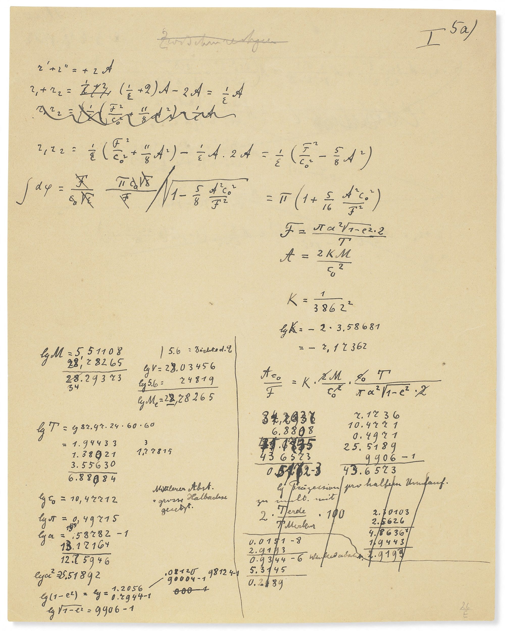 تمتلئ الصفحات بحسابات مترامية الأطراف ورموز متقاطعة مكتوبة بالحبر بشكل أساسي.
