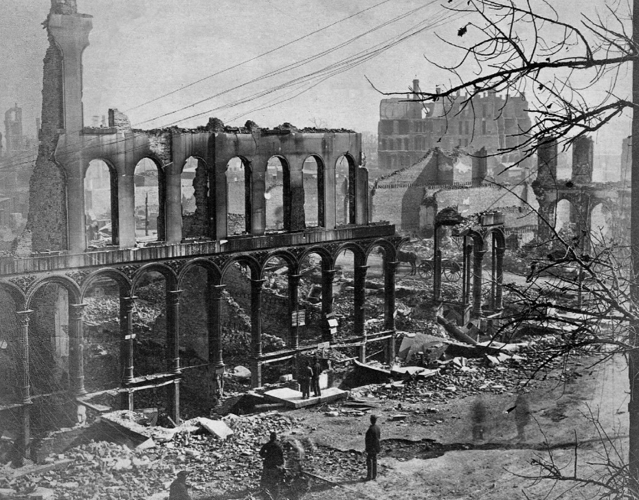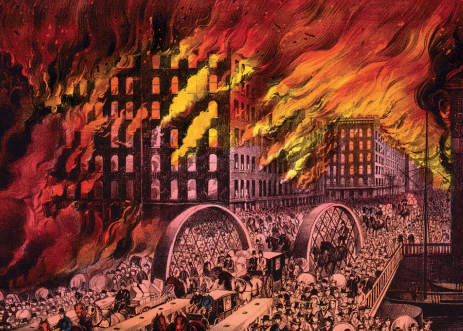 تسبب حريق اندلع في حظيرة في الجانب الجنوبي لمدينة شيكاغو والذي وصل إلى المنطقة التجارية منها بسبب رياح عاتية في دمار أزيد من 17 ألف مبنى وأكثر من 73 ميلاً من الشوارع، هذا الحريق أودى بحياة 300 شخص ونزح حوالي 90 ألف آخرين من سكان المدينة.